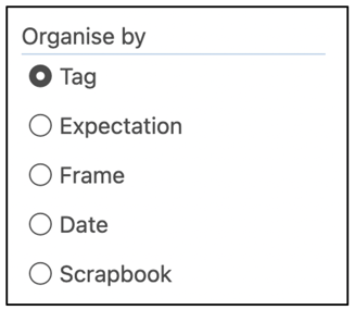 The Organise by control enables teachers to sort the evidence based on teacher-generated tags, expectations, frames, and dates.