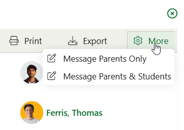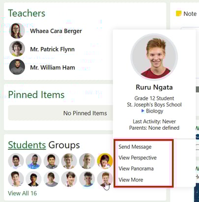 Mouse over a student’s name for a mini profile of the student. From the mini profile, teachers can: