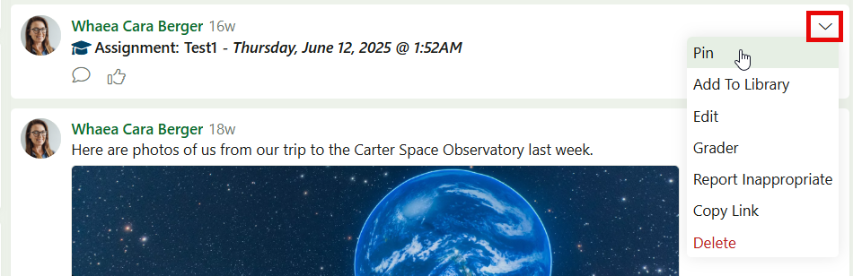 - Any item from the conversation and activity feed can be pinned or unpinned by a teacher
